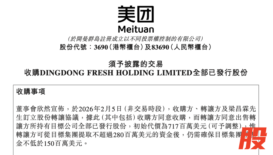 2月5日,美团在香港联交所发布公告,将以约7.17亿美元的初始对价,完成对叮咚买菜中国业务100%股权的收购。根据协议,转让方有权在2026年8月31日之前从目标集团提取不超过2.8亿美元的资金,但需确保目标集团净现金不低于1.5亿美元。公告称,基于估值日期(即2026年1月31日)按照市场法评估的目标集团股东全部权益的公允价值为10.06亿美元。