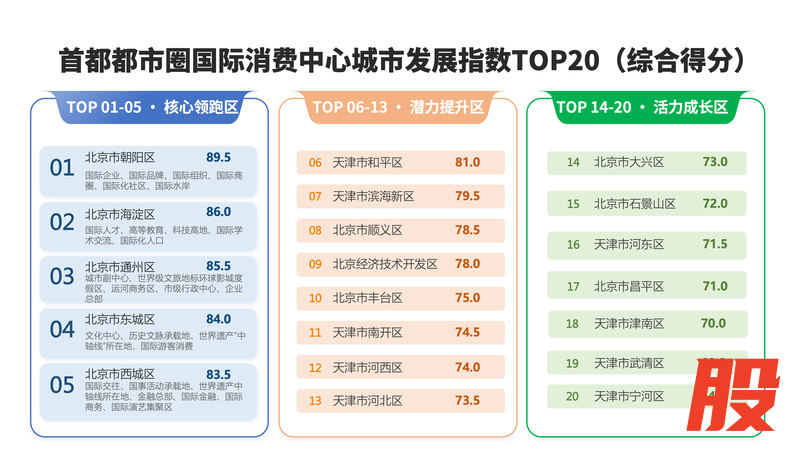 基于上述指标体系,《报告》将首都都市圈国际消费中心城市发展指数TOP20划分为三大梯队。核心领跑区前五位分别为北京市的朝阳区(89.5分)、海淀区(86.0分)、通州区(85.5分)、东城区(84.0分)、西城区(83.5分);潜力提升区包括天津市和平区、滨海新区,北京市顺义区、北京经济技术开发区、北京市丰台区等;活力成长区涵盖北京市的大兴区、石景山区、昌平区与天津市的河东区、津南区、武清区、宁河区等。