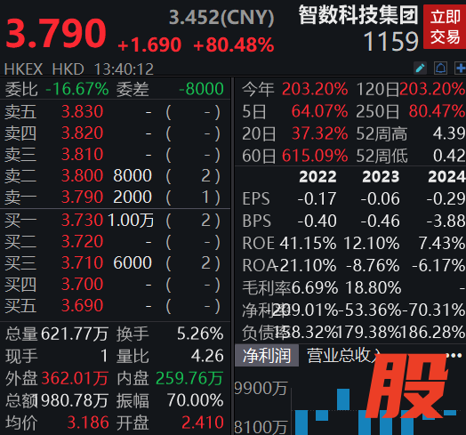 港股智数科技集团涨超80%港股智数科技集团涨超80%